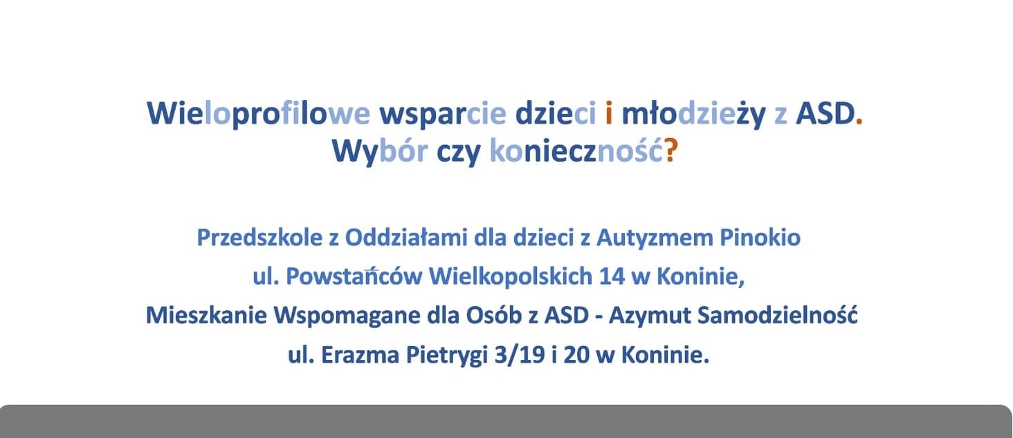- Wieloprofilowe wsparcie dzieci i młodzieży z ASD. Wybór czy konieczność? – na przykładzie dobrych praktyk (Przedszkole Pinokio, Mieszkanie wspomagane Azymut Samodzielność) – Anna Leśna-Szymańska – Przedszkole z Oddziałami dla Dzieci z Autyzmem PINOKIO