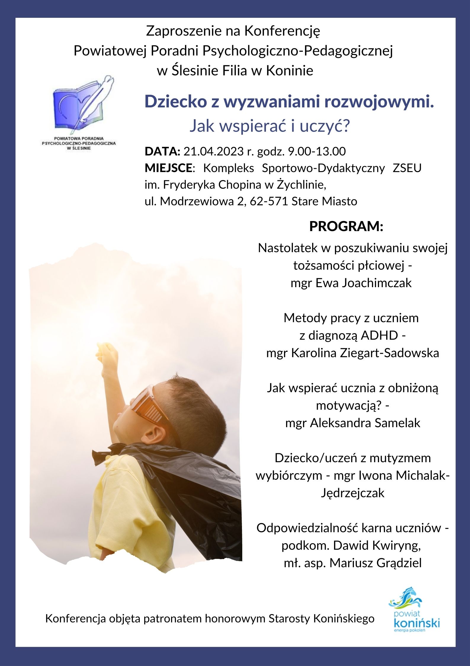 21 kwietnia b.r. odbyła się kolejna konferencja problemowa zorganizowana przez Powiatową Poradnię Psychologiczno-Pedagogiczną w Ślesinie pod honorowym patronatem Starosty Konińskiego pt. DZIECKO Z WYZWANIAMI ROZWOJOWYMI. Jak wspierać i uczyć? Spotkanie adresowane było do nauczycieli i rodziców placówek oświatowych powiatu konińskiego oraz wszystkich, którzy na co dzień wspierają dzieci i młodzież w ich rozwoju oraz uczestniczą w tworzeniu optymalnej przestrzeni dla ich rozwoju i kształcenia.