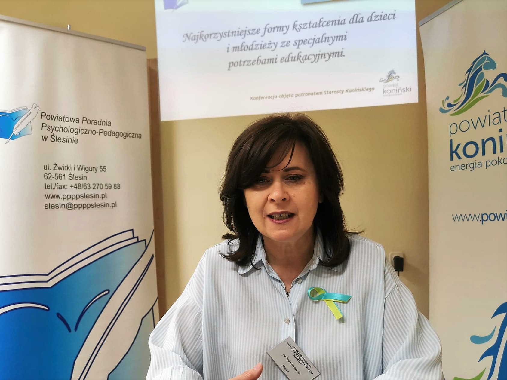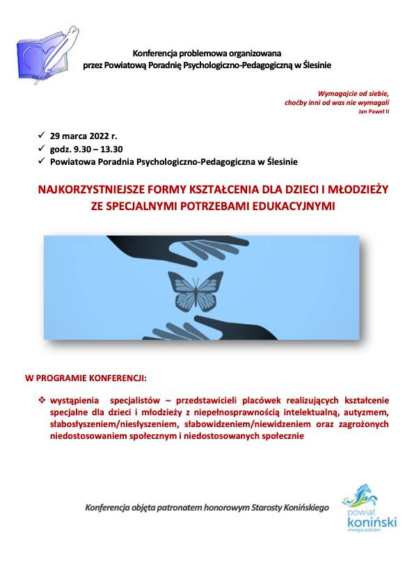 29 marca b.r. odbyła się kolejna konferencja problemowa zorganizowana przez Powiatową Poradnię Psychologiczno-Pedagogicznej w Ślesinie pod honorowym patronatem Starosty Konińskiego pt. NAJKORZYSTNIEJSZE FORMY KSZTAŁCENIA DLA DZIECI I MŁODZIEŻY ZE SPECJALNYMI POTRZEBAMI EDUKACYJNYMI. Spotkanie adresowane było do rodziców i nauczycieli placówek oświatowych powiatu konińskiego, jak i tych wszystkich, którzy zainteresowani są tworzeniem optymalnej przestrzeni dla rozwoju oraz kształcenia dzieci i młodzieży ze specjalnymi potrzebami edukacyjnymi.