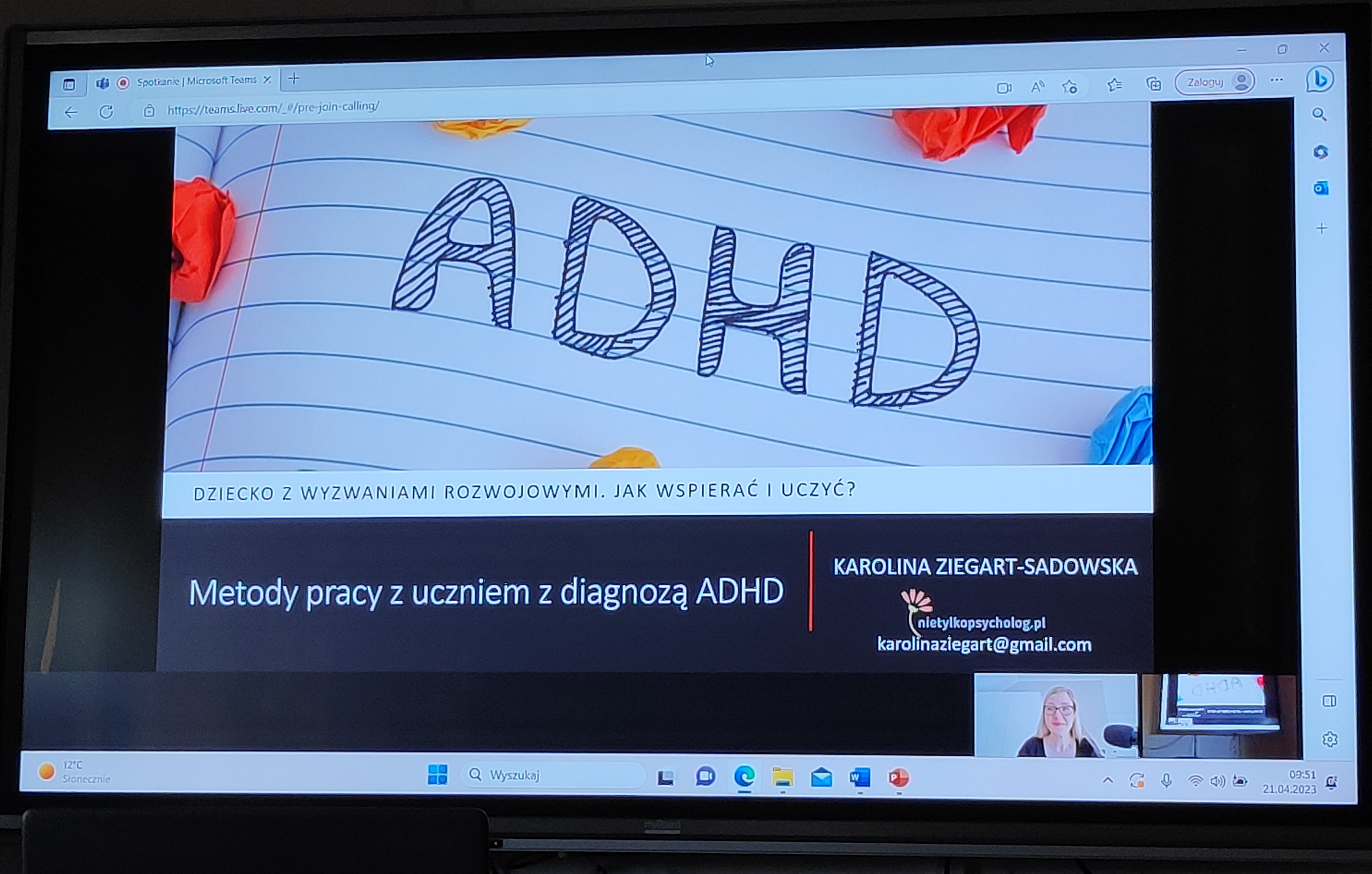 - Metody pracy z uczniem z diagnozą ADHD. mgr Karolina Ziegart- Sadowska – psycholog, certyfikowany psychoterapeuta pracujący w nurcie poznawczo-behawioralnym z dziećmi, młodzieżą i dorosłymi